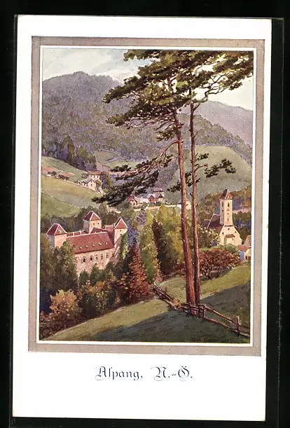 Künstler-AK Aspang, Totalansicht aus der Vogelschau