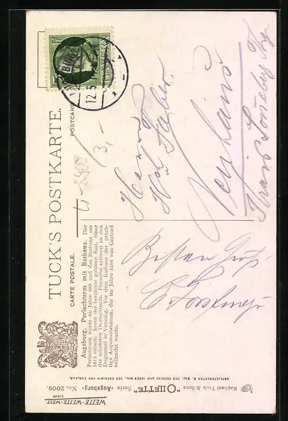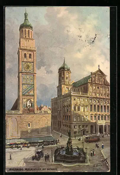 Künstler-AK Augsburg, Perlachturm mit Rathaus