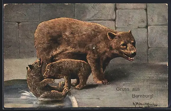 Künstler-AK August Müller - München: Bär mit Nachwuchs