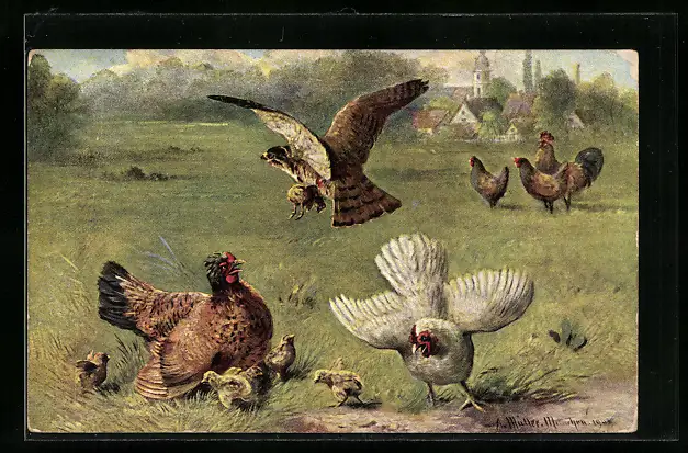 Künstler-AK August Müller - München: Falke greift ein Hühnerküken