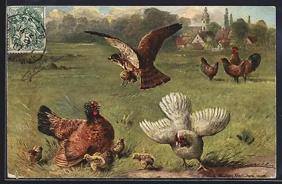 Künstler-AK August Müller - München: Falke greift sich Hühnerküken