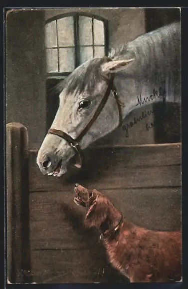 Künstler-AK August Müller - München: Hund schaut zu Pferd auf