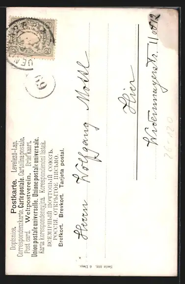 Personenbezogene Daten auf der Rückseite der Karte wurden durch blauen Textmarker unkenntlich gemacht. Die blauen Stellen sind auf die Vorderseite durchgeweicht und wirken sich negativ auf das Postkartenfoto aus