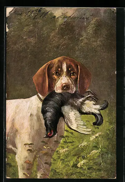 Künstler-AK August Müller - München: Jagdhund mit Birkhahn im Maul