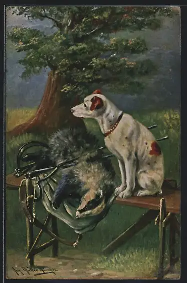 Künstler-AK August Müller - München: Jagdhund mit erlegtem Dachs