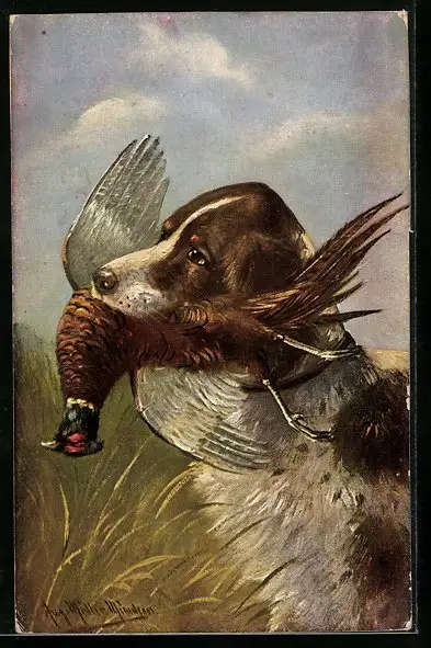 Künstler-AK August Müller - München: Jagdhund mit erlegtem Fasan