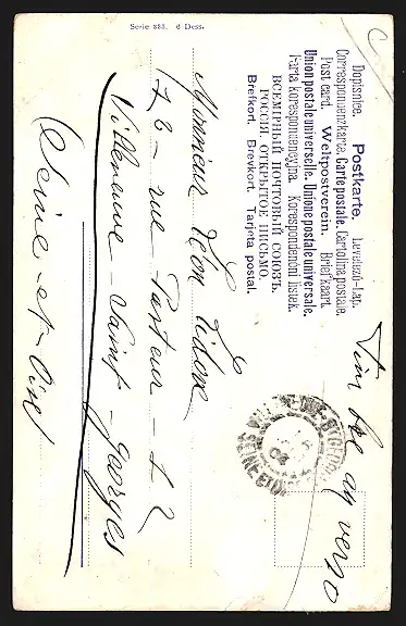 Personenbezogene Daten auf der Rückseite der Karte wurden durch blauen Textmarker unkenntlich gemacht. Die blauen Stellen sind auf die Vorderseite durchgeweicht und wirken sich negativ auf das Postkartenfoto aus
