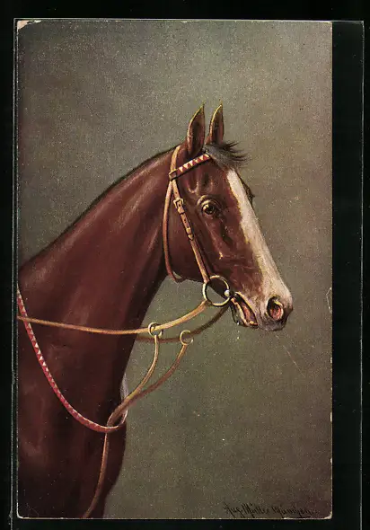 Künstler-AK August Müller - München: Reitpferd mit Zaumzeug und weisser Blesse