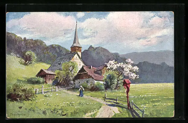 Künstler-AK August Splitgerber: Bergdorf im Frühling