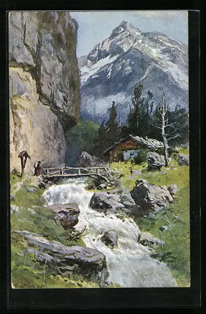Künstler-AK August Splitgerber: Berglandschaft mit Gebirgsflusslauf