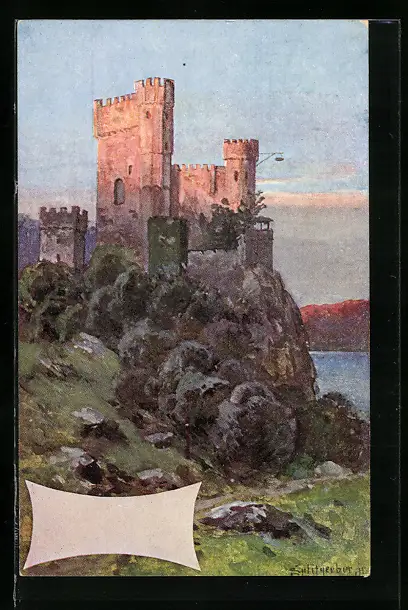 Künstler-AK August Splitgerber: Burgruine in der Abenddämmerung