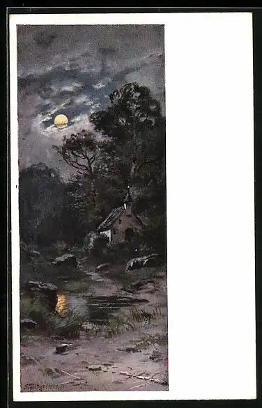 Künstler-AK August Splitgerber: Kirche an einem Bach im Mondschein