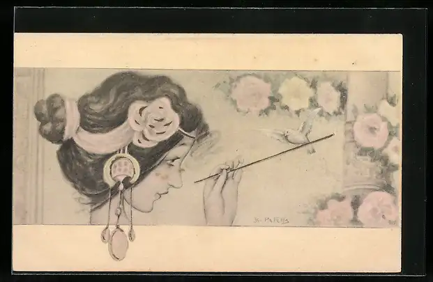 Künstler-AK B. Patella: Dame mit weisser Taube, Jugendstil