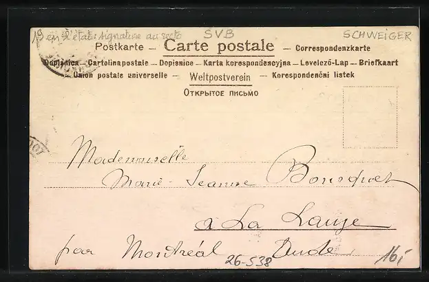 Personenbezogene Daten auf der Rückseite der Karte wurden durch blauen Textmarker unkenntlich gemacht. Die blauen Stellen sind auf die Vorderseite durchgeweicht und wirken sich negativ auf das Postkartenfoto aus