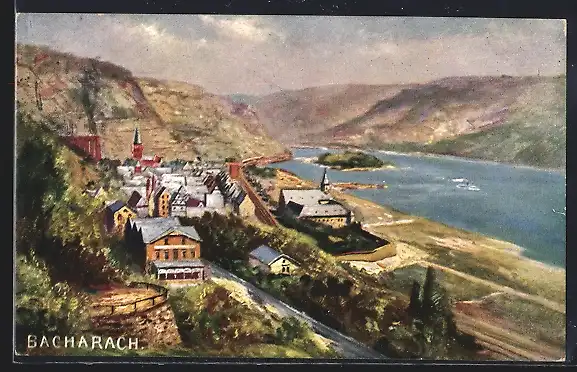 Künstler-AK Bacharach, Ortsansicht aus der Vogelschau