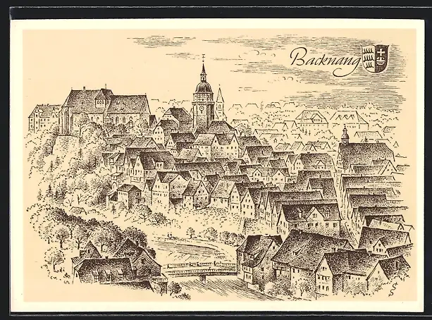 Künstler-AK Backnang, Ortspartie aus der Vogelschau, Wappen