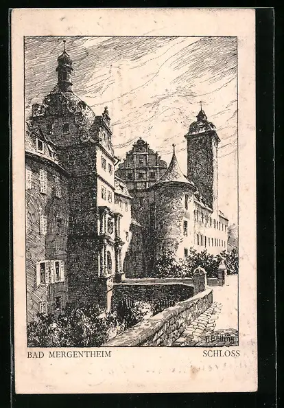 Künstler-AK Bad Mergentheim, Wegpartie am Schloss