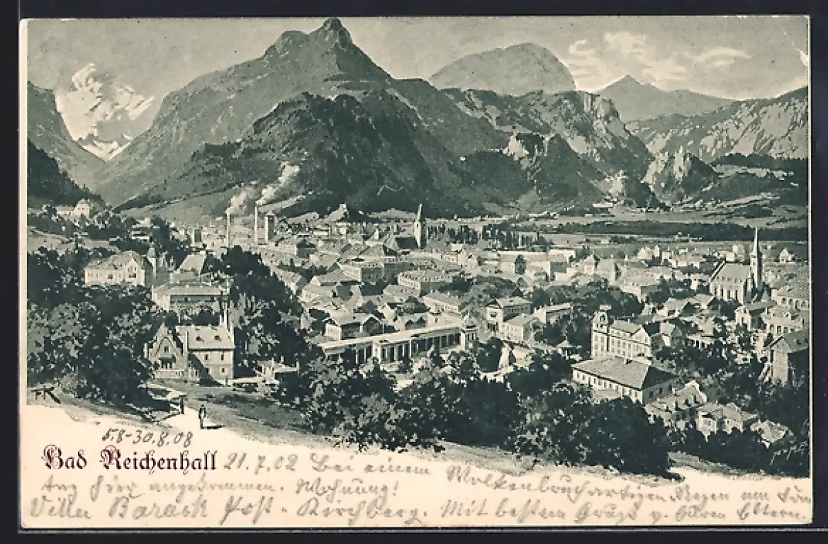 Künstler-AK Bad Reichenhall, Ortsansicht mit umliegenden Bergen