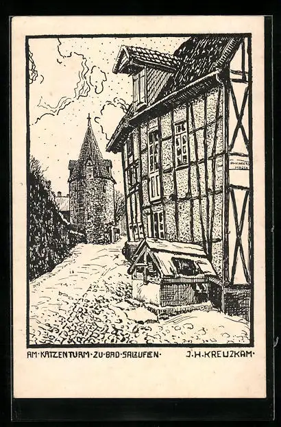 Künstler-AK Bad Salzuflen, Strassenpartie am Katzenturm