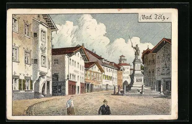 Künstler-AK Bad Tölz, Strassenpartie mit Geschäften und Denkmal