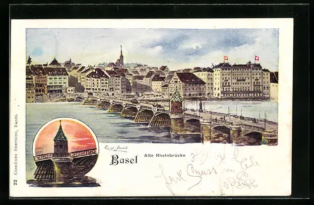 Künstler-AK Basel, Partie an der alten Rheinbrücke