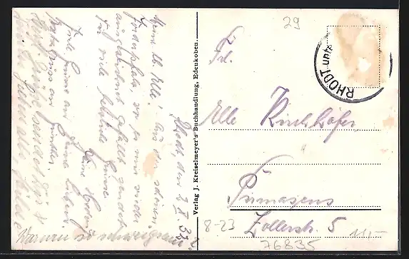 Personenbezogene Daten auf der Rückseite der Karte wurden durch blauen Textmarker unkenntlich gemacht. Die blauen Stellen sind auf die Vorderseite durchgeweicht und wirken sich negativ auf das Postkartenfoto aus