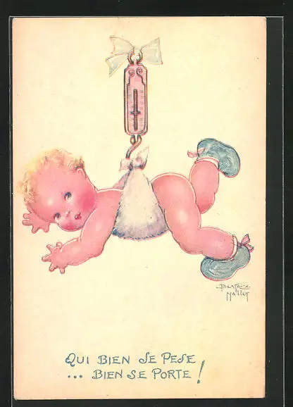 Künstler-AK Beatrice Mallet: Baby an einer Waage hängend
