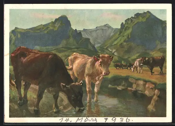 Künstler-AK Bergbach mit Kühen, Pro Juventute