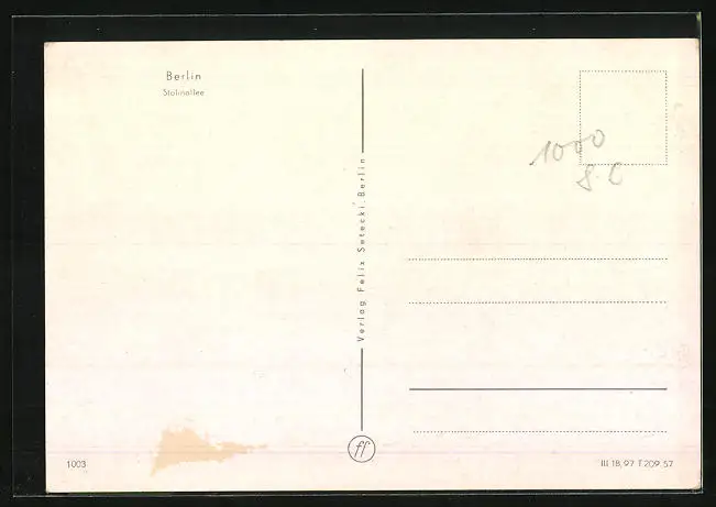 Personenbezogene Daten auf der Rückseite der Karte wurden durch blauen Textmarker unkenntlich gemacht. Die blauen Stellen sind auf die Vorderseite durchgeweicht und wirken sich negativ auf das Postkartenfoto aus