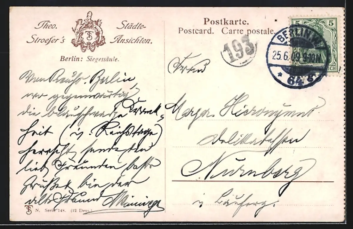 gelaufen 1909, Eckknick oben links, guter Zustand