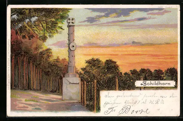 Künstler-AK Berlin-Schildhorn, Ortspartie mit Denkmal