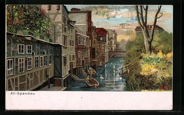Künstler-AK Berlin-Spandau, Uferpartie mit Booten