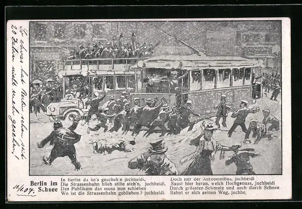 Künstler-AK Berlin, Strassenbahn ist im Schnee stecken geblieben