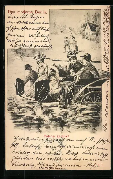 Künstler-AK Berliner Familie lenkt das Auto ins Wasser