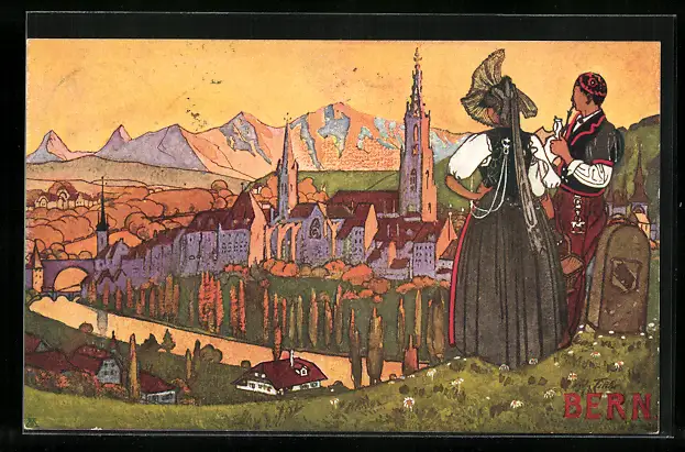 Künstler-AK Bern, ein Ehepaar schaut auf die Stadt hinab