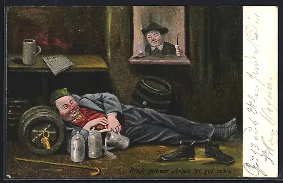 Künstler-AK Betrunkener Mann schläft in seiner Werkstatt