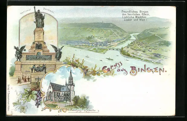 Künstler-AK Bingen, Ortsansicht aus der Vogelschau, National-Denkmal