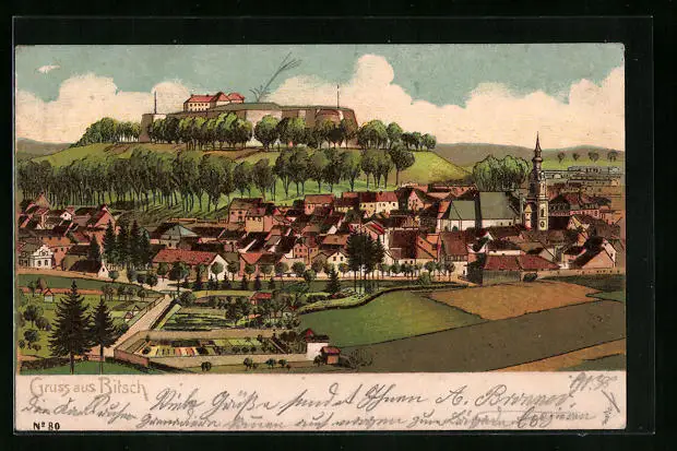 Künstler-AK Bitsch, Totalansicht mit Kirche