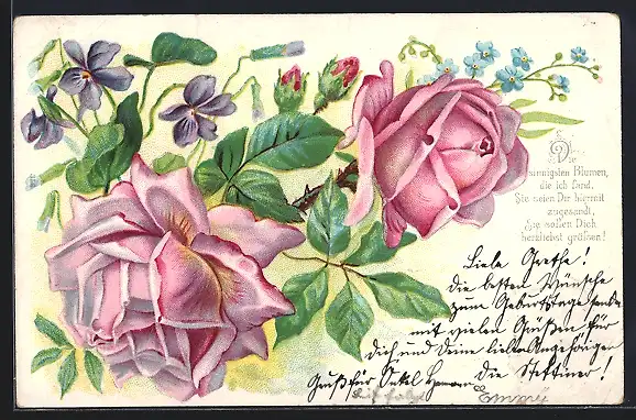 Künstler-AK Blühende Rosen, Vergissmeinnicht und Veilchen