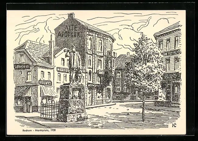 Künstler-AK Bochum, Marktplatz mit Denkmal, 1930