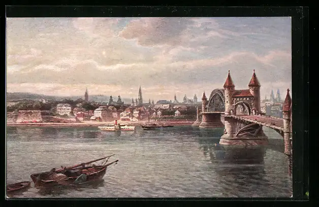 Künstler-AK Bonn, Rheinbrücke mit Dampfer
