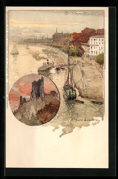 Künstler-AK Bonn, Stadtansicht mit Drachenfels