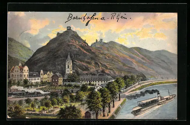 Künstler-AK Bornhofen am Rhein, Ortsansicht mit Dampfer