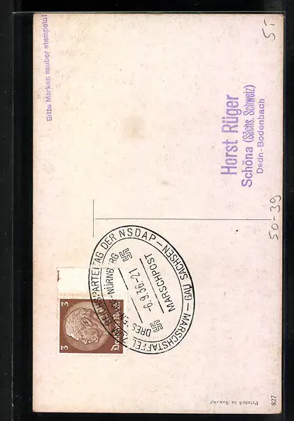 Personenbezogene Daten auf der Rückseite der Karte wurden durch blauen Textmarker unkenntlich gemacht. Die blauen Stellen sind auf die Vorderseite durchgeweicht und wirken sich negativ auf das Postkartenfoto aus