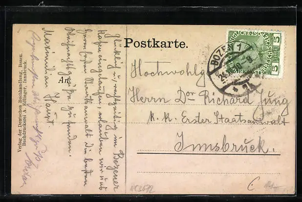 gelaufen 1910, Eckknicke re., Stempelspur, guter Zustand