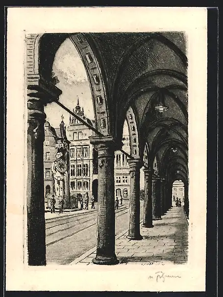 Künstler-AK Bremen, Rathausarkaden mit Roland