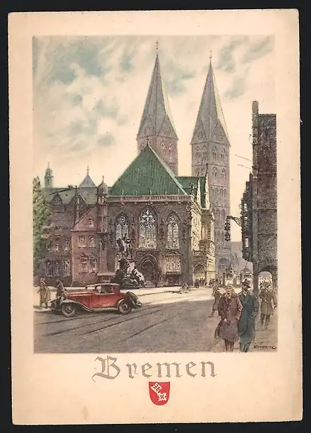 Künstler-AK Bremen, Rathauspartie mit Auto