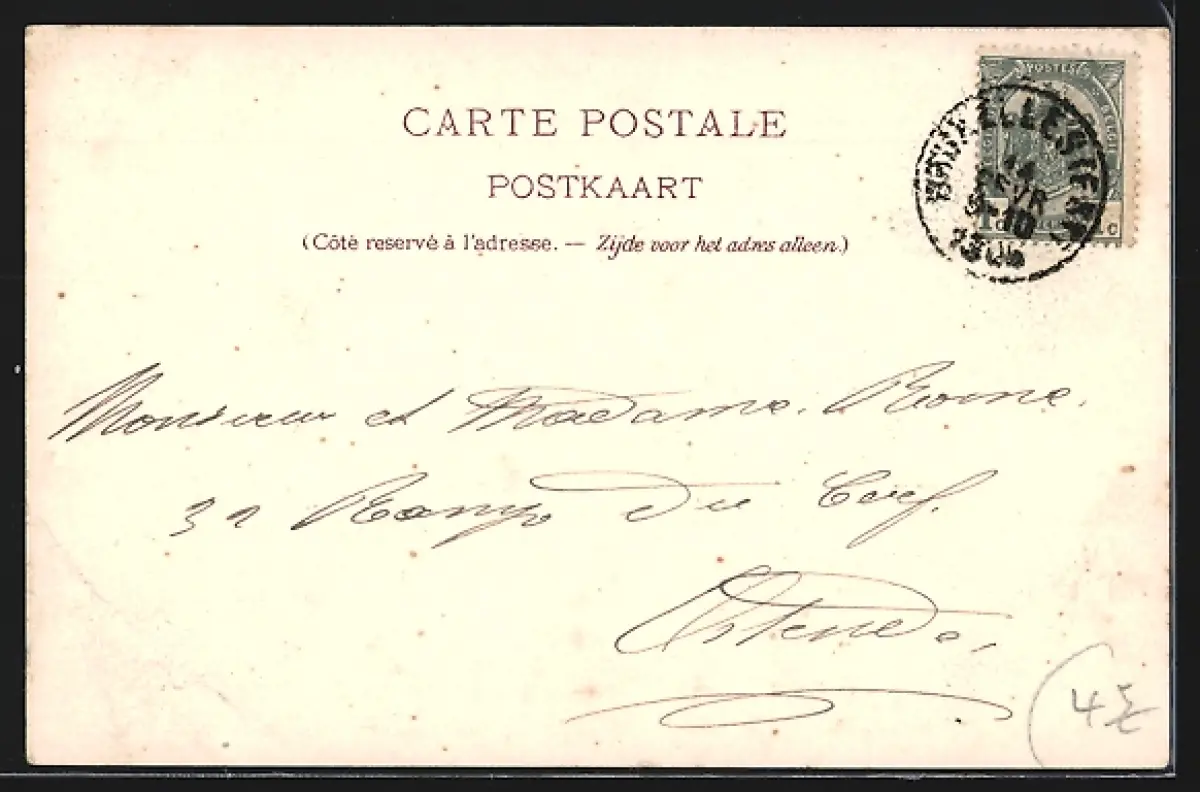Personenbezogene Daten auf der Rückseite der Karte wurden durch blauen Textmarker unkenntlich gemacht. Die blauen Stellen sind auf die Vorderseite durchgeweicht und wirken sich negativ auf das Postkartenfoto aus
