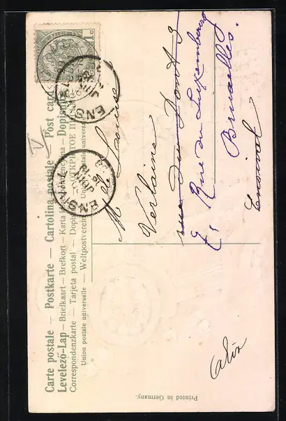 Personenbezogene Daten auf der Rückseite der Karte wurden durch blauen Textmarker unkenntlich gemacht. Die blauen Stellen sind auf die Vorderseite durchgeweicht und wirken sich negativ auf das Postkartenfoto aus