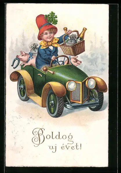 Künstler-AK Bub mit vielen Glücksbringern im Auto